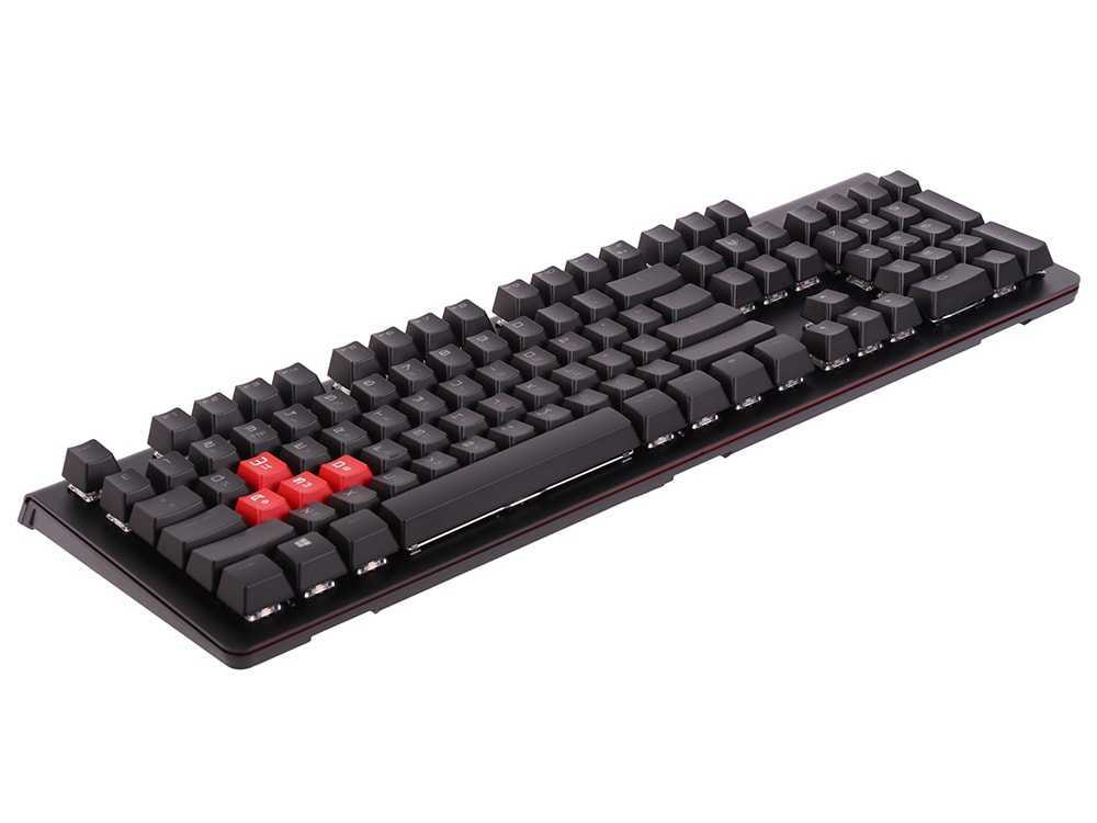 Плюсы: игровая клавиатура Bloody имеет самые быстрые в мире механические переключатели. Поставляется гаджет вместе с восемью съемными кейкапами красного цвета и специальным инструментом для их замены. Ширина деки составляет 488 мм, поэтому на ней размещена полноразмерная раскладка. В нижней части корпуса расположена несъемная подставка для ладоней.