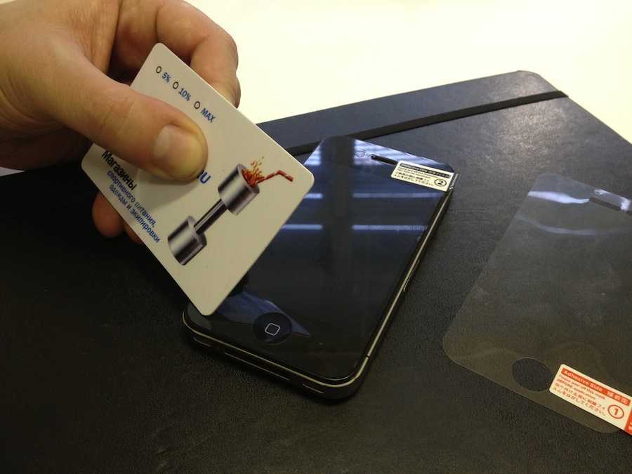 - Нужно приложить пленку к экрану и плавно, выгоняя картой пузырьки, выравнивать ее по стеклу;