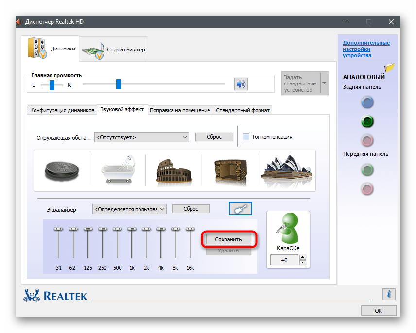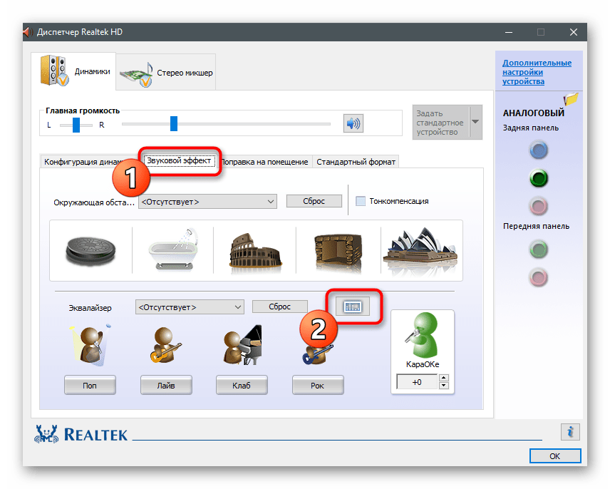 Если на ПК установлена звуковая схема Realtek, то решит проблему специальная утилита под названием «Realtek HD»: