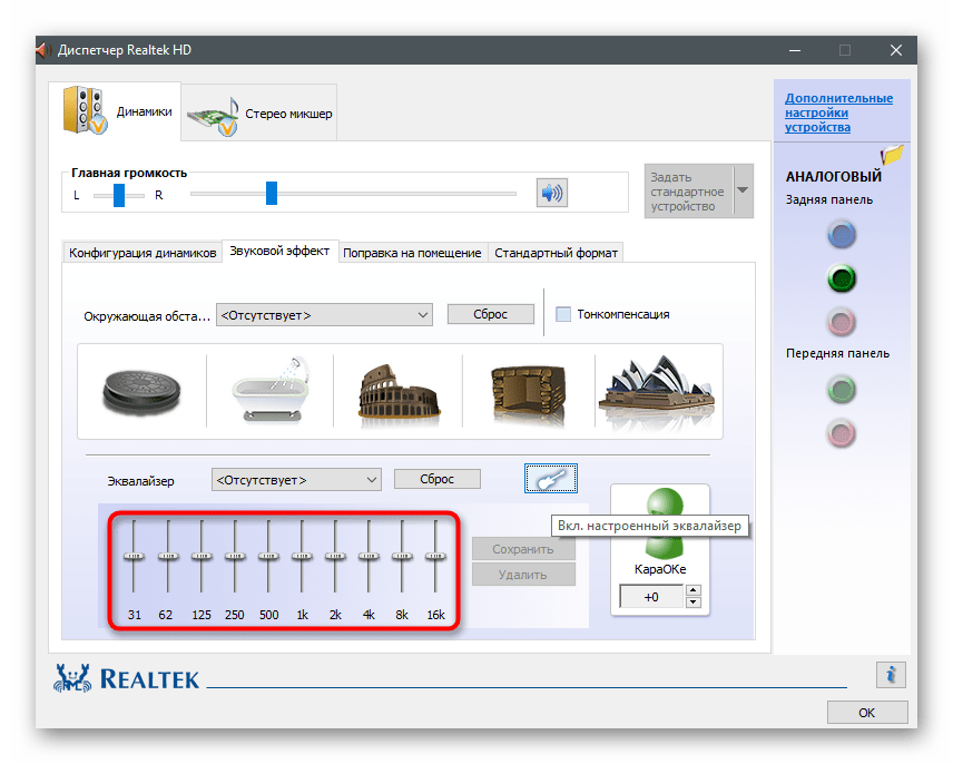 Для усиления громкости, если ее основного запаса не хватает, перейдите в «Звуковой эффект» и нажмите выделенную на скриншоте кнопку, открывающую все ползунки эквалайзера.
