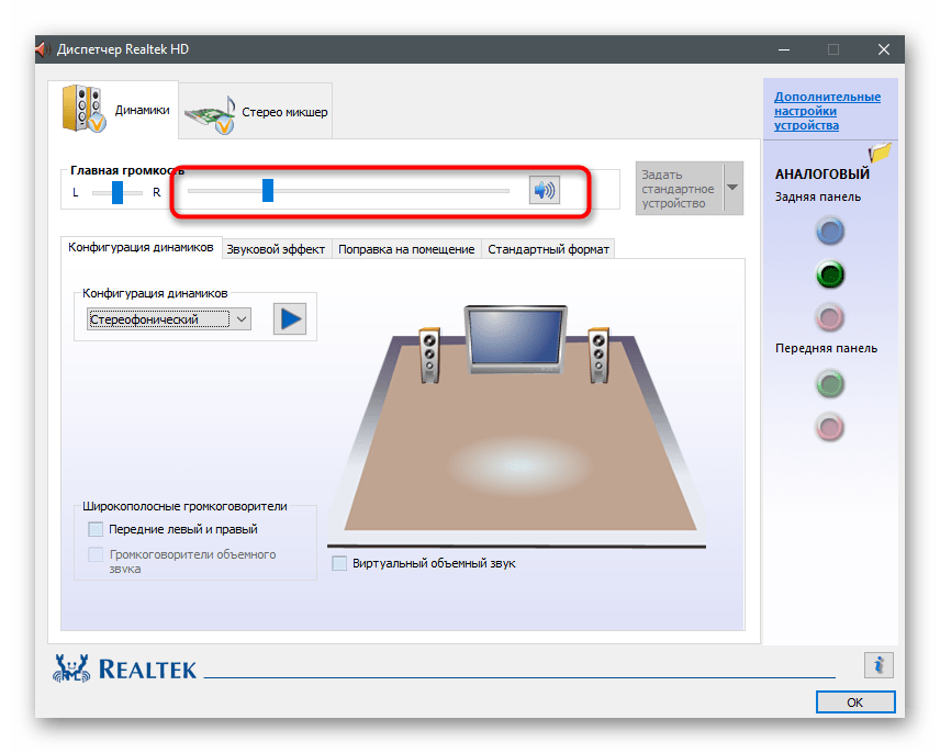 - После запуска уже выбрана необходимая вкладка «Динамики», где можно регулировать общую громкость звука.