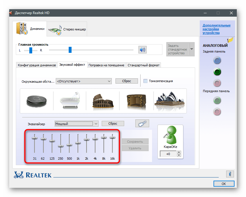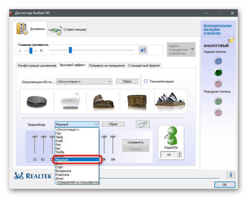 Если качество звука становится заметно хуже, чуть опустите частоты, чтобы убрать хрипение или другие проявления проблемы. Можете также попробовать заготовленный вариант эквалайзера «Мощный».