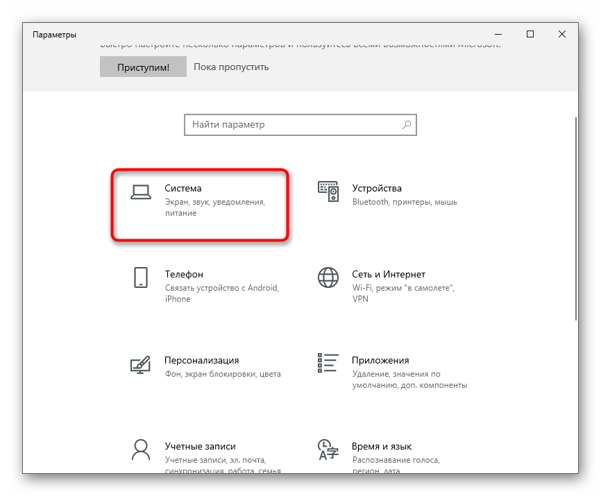 - Откройте меню «Пуск», перейдите в приложение «Параметры» и выберите первый раздел — «Система».