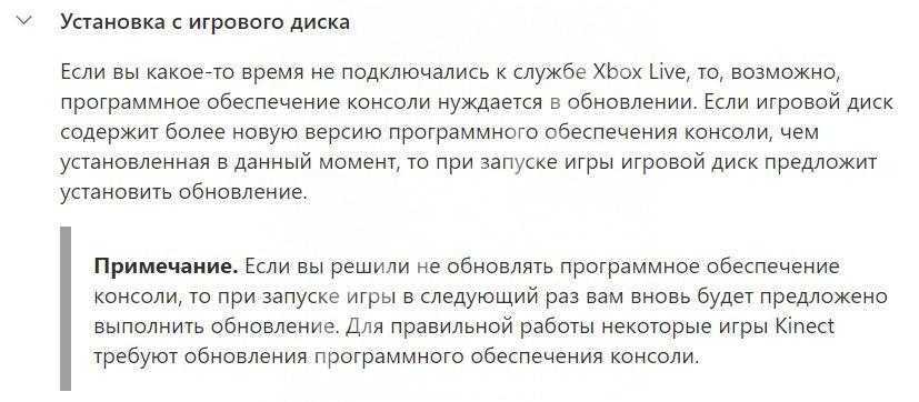 Если вы долгое время не подключались к IKS Box Live при использовании консоли, возможно, потребуется обновить программное обеспечение приставки. Если на диске с игрой есть более новая версия, во время запуска игры появится запрос на обновление для XBOX 360. Если вы откажетесь, предложение загрузить новое программное обеспечение появится при следующем входе в систему. Однако не игнорируйте загрузку новой версии, поскольку для некоторых игр Kinect требуется новое программное обеспечение.