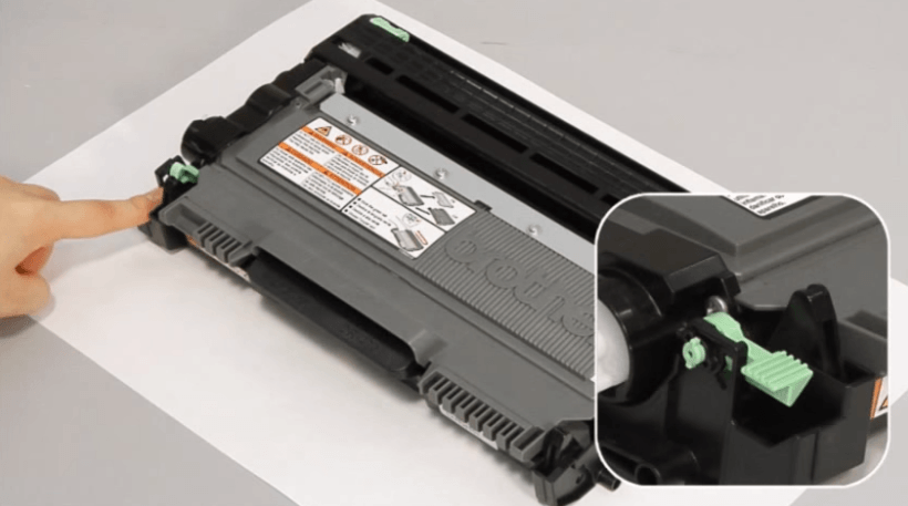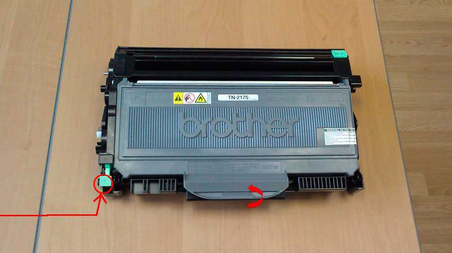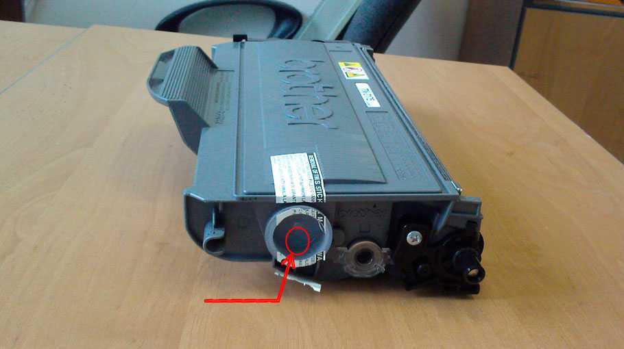 - Вставьте драм-юнит обратно в принтер brother. В левой его части можно наблюдать отверстие, из которого виднеется кнопка обнуления.