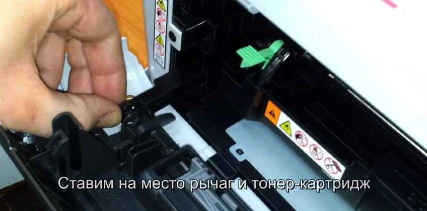 Теперь нужно дождаться, когда аппарат утихнет. После этого нужно отпустить тот самый датчик закрытия панели, который мы всё это время удерживали отверткой. После этого нужно соединить переднюю крышку с рычагом (см. фотографию ниже, надо выдвинуть рычаг, который находится в МФУ) и установить на место собранный картридж.
