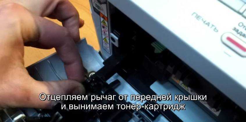 Далее извлекаем тонер-картридж. Достаем картридж из устройства за специальную ручку.