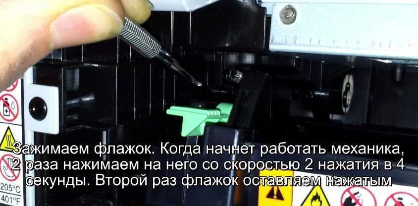 Далее нужно сымитировать наличие картриджа. Для этого нужно зажать флажок, как только начнут крутиться шестеренки отжимаете и потом снова нажимаете. После этого повторяете процедуру — отжимаете и нажимаете. Таким образом, нужно зажать флажок 2 раза за 4 секунды. С первого раза может не получиться. В таком случае нужно будет просто попробовать еще раз.