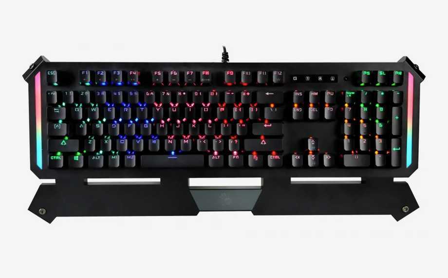 Плюсы: игровая клавиатура Bloody имеет самые быстрые в мире механические переключатели. Поставляется гаджет вместе с восемью съемными кейкапами красного цвета и специальным инструментом для их замены. Ширина деки составляет 488 мм, поэтому на ней размещена полноразмерная раскладка. В нижней части корпуса расположена несъемная подставка для ладоней.
