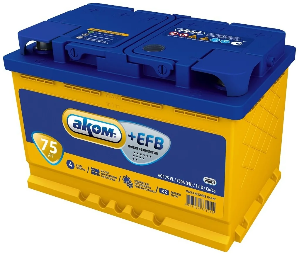 - EFB — новейшие АКБ с двойным ресурсом и увеличенными токами. Они не боятся глубокого разряда и коррозии на пластинах. Ёмкость — 55-100 А·ч, токи — 530-930 А. Все семь моделей производятся для автомобилей премиум-класса с системой Start-Stop.