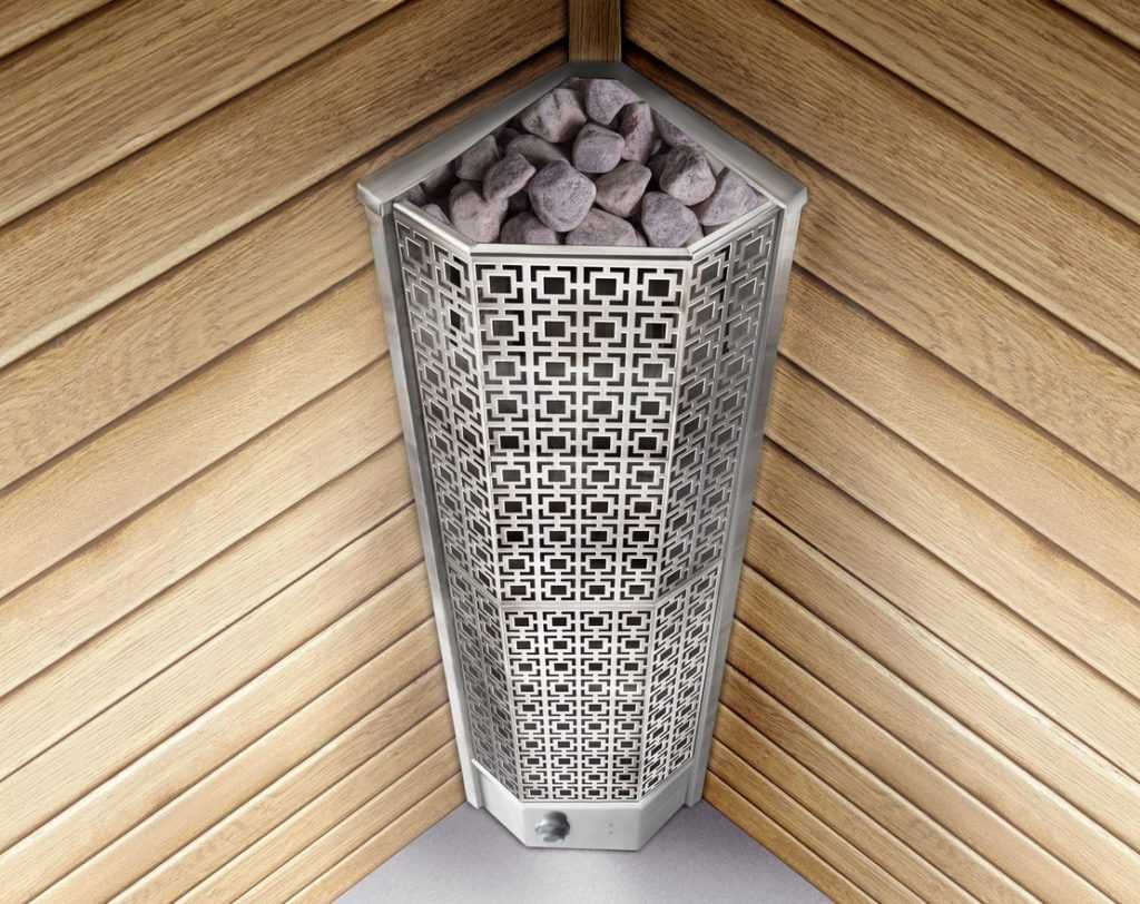 Вмещает до 22 кг камней. Есть панель управления с регулировкой температуры и таймером.