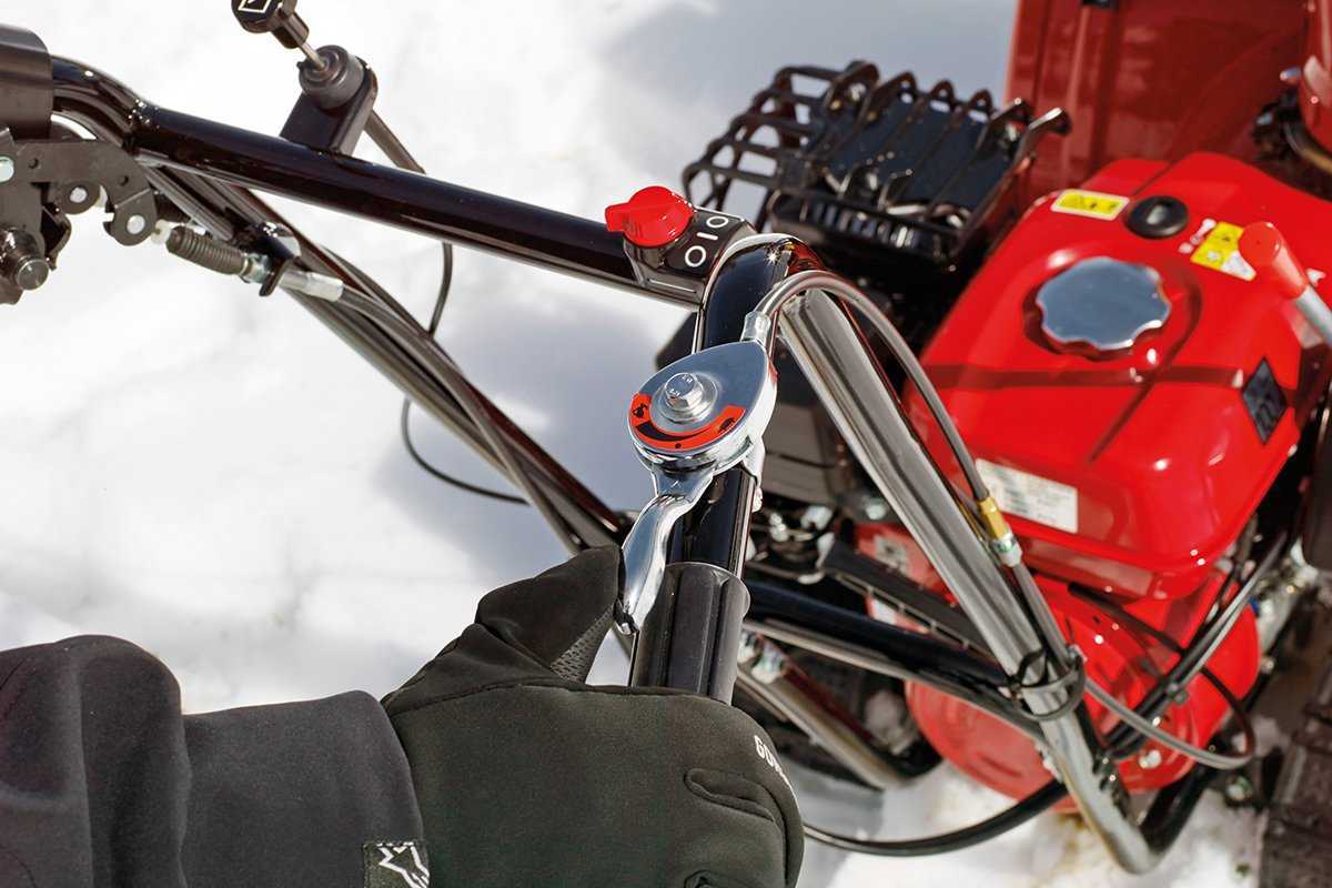 Кроме того, среди дополнительных функций этого представителя отмечают возможность регулировать угол выброса снега, используя специальную рукоятку, а также наличие дополнительных колес, которые положительно влияют на проходимость и маневренность устройства.