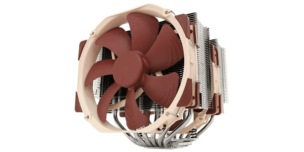 На втором месте Noctua NH-D15. Самый дорогой башенный кулер в моём рейтинге. Компания Noctua уже не первый год представляет мощные и тихие системы охлаждения, и пока что NH-D15 является лучшим, что они могут предложить. Состоит из массивного алюминиевого радиатора, двух вентиляторов и шести медных тепловых трубок. Если у вас не самый горячий процессор, один вентилятор можно снять и ещё больше снизить уровень шума. Однако даже при максимальной скорости в 1500 оборотов в минуту и использовании двух вентиляторов уровень шума составит всего 24,6 децибел. Цена — 9 тысяч рублей, при такой стоимости отводит до 220 ватт тепла, а значит, может охладить даже самые мощные и горячие процессоры от Intel и AMD.