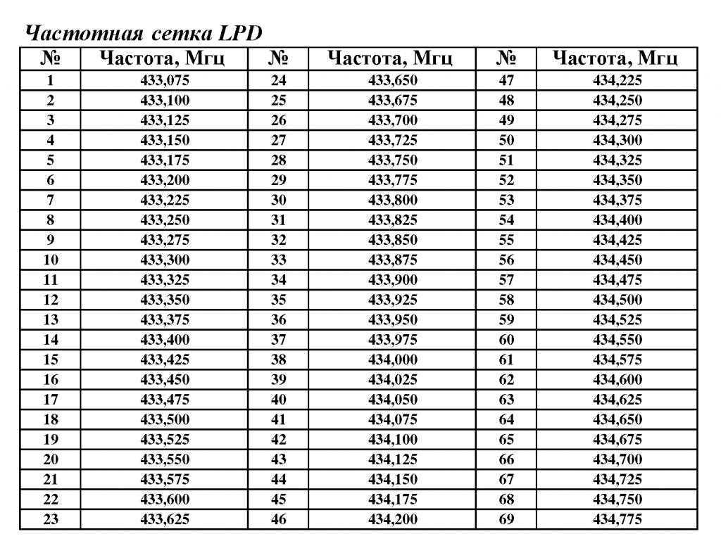 Разрешенные в России частоты LPD-диапазона 433 МГц — 434 МГц. LPD — это 69 разрешенных радиоканалов с шагом в 12,5 или 25 кГц, мощность не должна превышать 10 мВт, запрещено использовать также внешние антенны и репитеры. Ниже приведены разрешенные частоты в России LPD-диапазона.