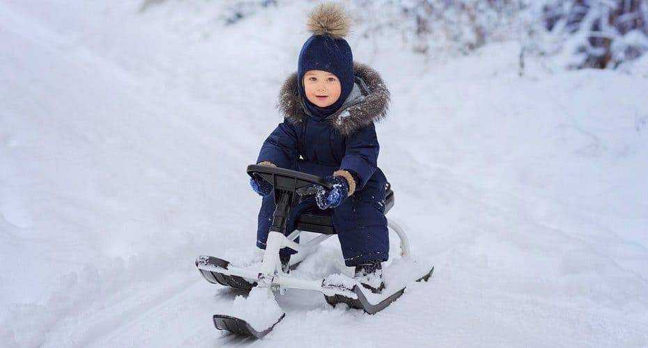 Подобные конструктивные особенности придают детскому транспортному средству больше манёвренности, лёгкости, безопасности. Последний параметр крайне важен, поскольку ребёнок, катящийся со снежной горы, сможет в любой момент притормозить с помощью ручного либо ножного тормоза.