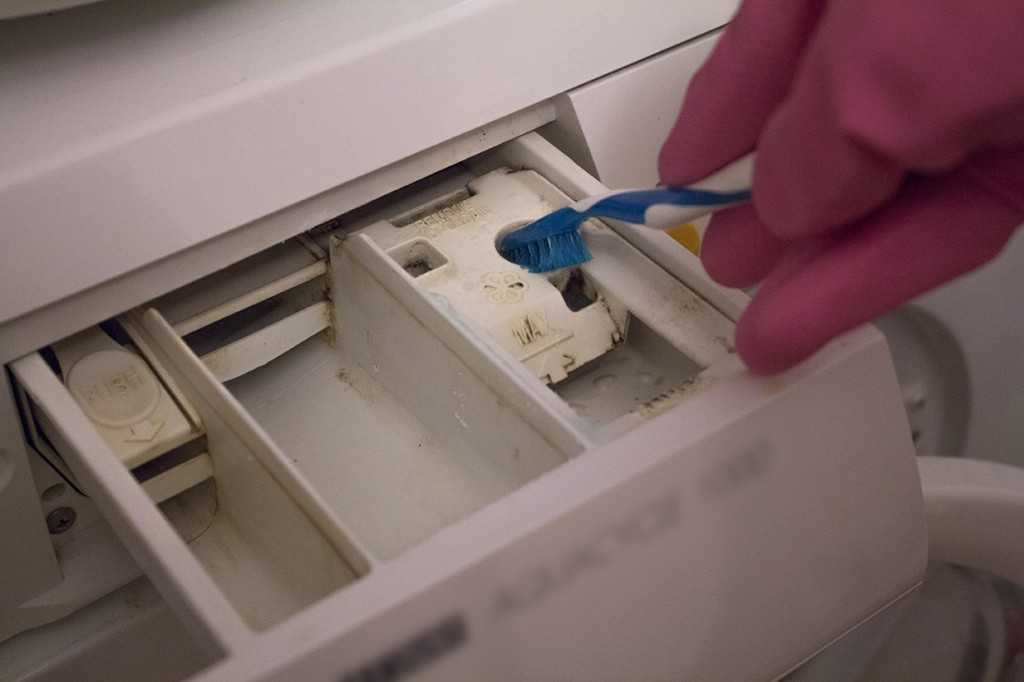 Чтобы вымыть лоток для стиральных средств, необходимо его аккуратно вынуть. Многие пренебрегают этим и довольствуются лишь тем, что протирают его там, куда дотянется рука. При этом на задней поверхности и внешних стенках чаще всего заводиться грибок. Происходит это потому, что в дозаторе всегда присутствует влага и много остатков порошка, тем более, если вы используете его в сухом виде. Чистить этот контейнер необходимо постоянно через каждые две-три стирки.