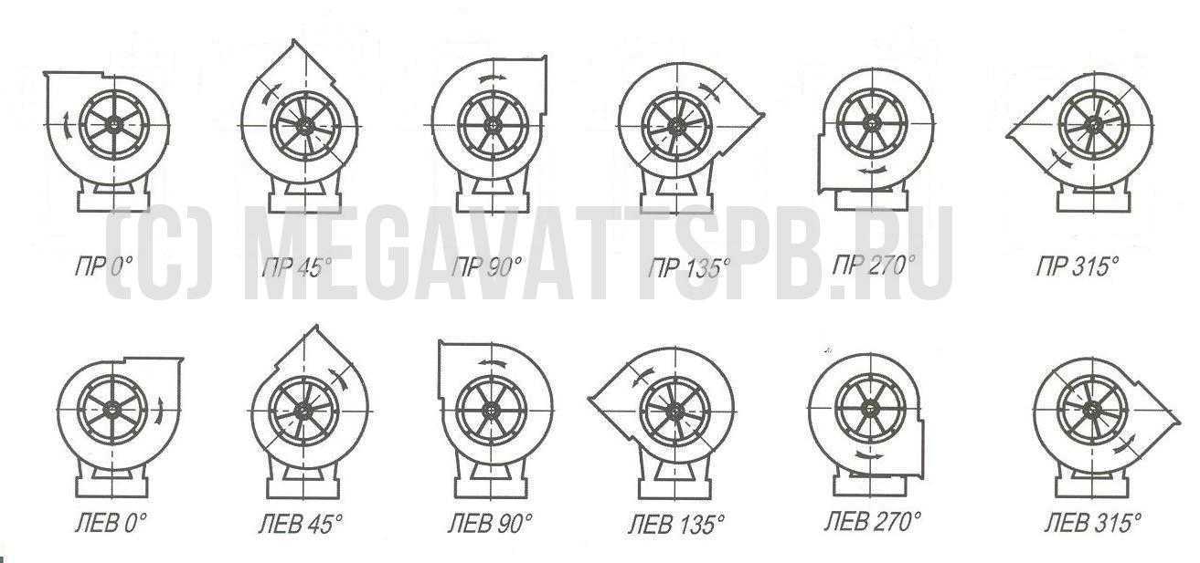 Для начала нужно подойти к агрегату со стороны двигателя. Отсюда должно быть видно, в какую сторону крутится рабочее колесо. Левое вращение осуществляется против часовой стрелки, а правое – по часовой стрелке. Угол поворота улитки может быть разнообразным. Он варьируется от 0 до 270°. Интервал вращения составляет – 15°.