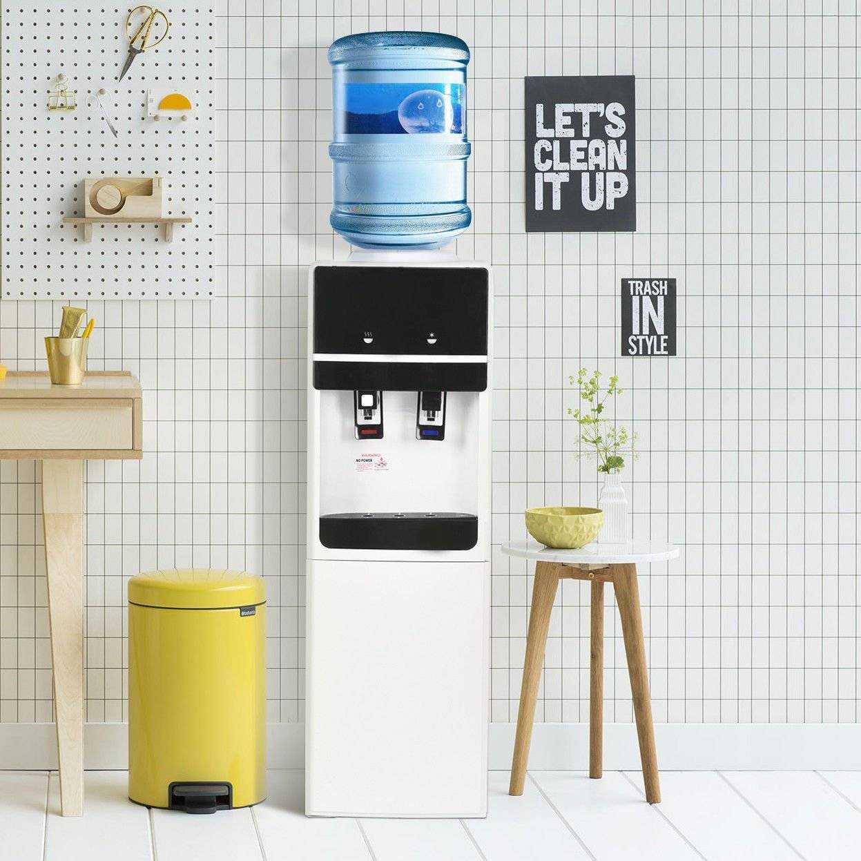 Резервуар прибора разделен на две половины. В одном вода может нагреться до +96°С, а в другом охлаждается с помощью компрессора или электронным способом по принципу Пельтье. В первом случае модели выпускают с напольной установкой, а температура воды опускается до +5°С. Электронная модель компактно устанавливается на стол, но вода не охлаждается ниже +10°С.