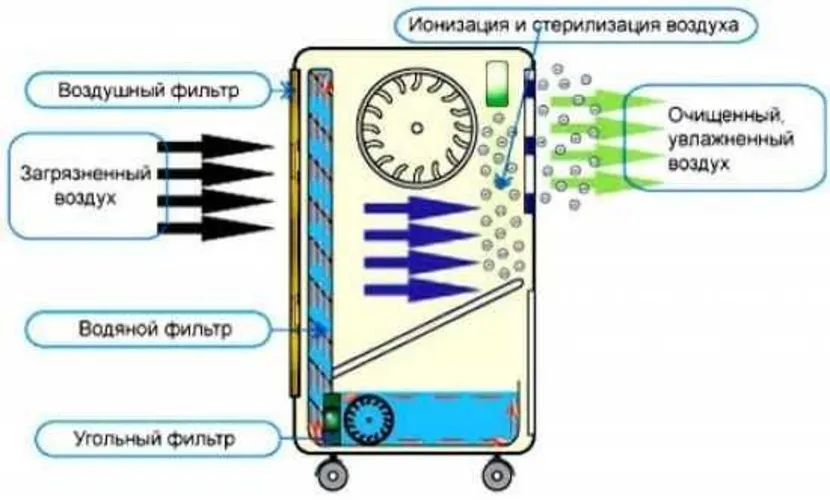 - после пропитывания водой губчатого фильтра происходит испарение – жидкость забирает тепло из воздушной массы;