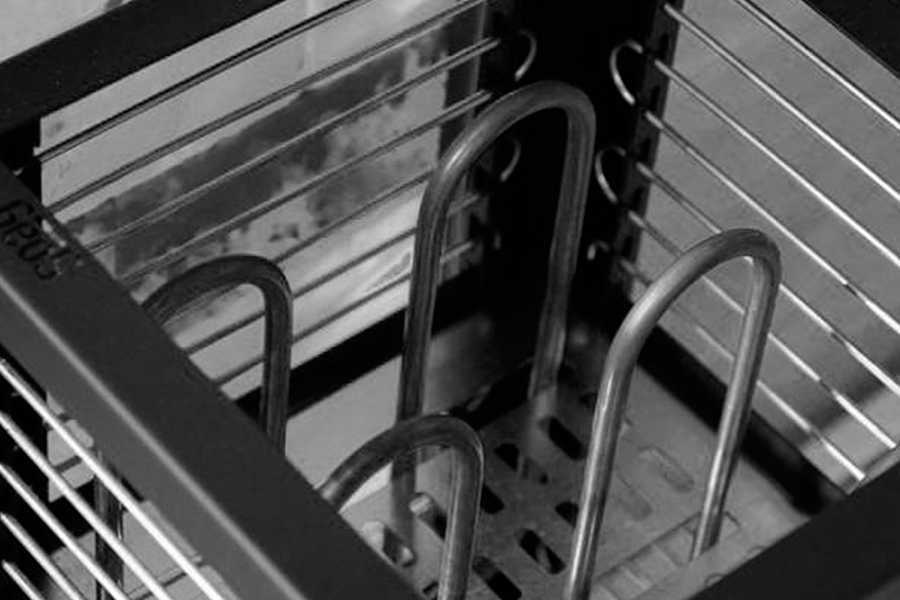 - Нагревательный элемент – для подогрева камней используется ТЭН. ЭлектроТЭН быстро прогревает каменку, после чего тепло поступает в парилку.
