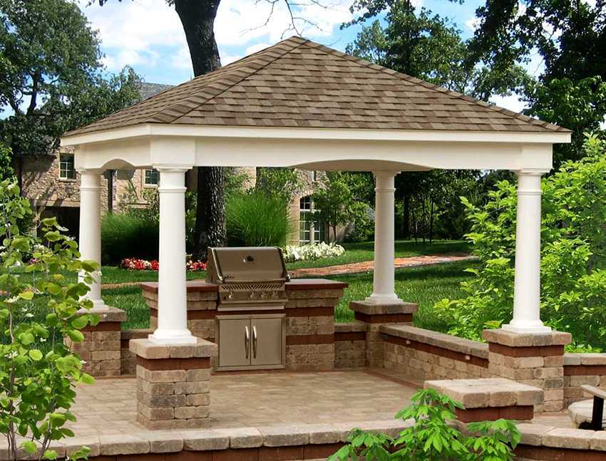 Изготавливая навес для мангала своими руками, крышу можно сделать полукруглой. Такая конструкция смотрится необычно и привлекательно. Арка навеса выполняется так, чтобы вода не скапливалась на ее поверхности, а стекала вниз по сторонам. Но форма крыши может быть любой, даже имеющей вывод дымоходной трубы. Это обеспечит не только надежную защиту, но и отличную тягу.