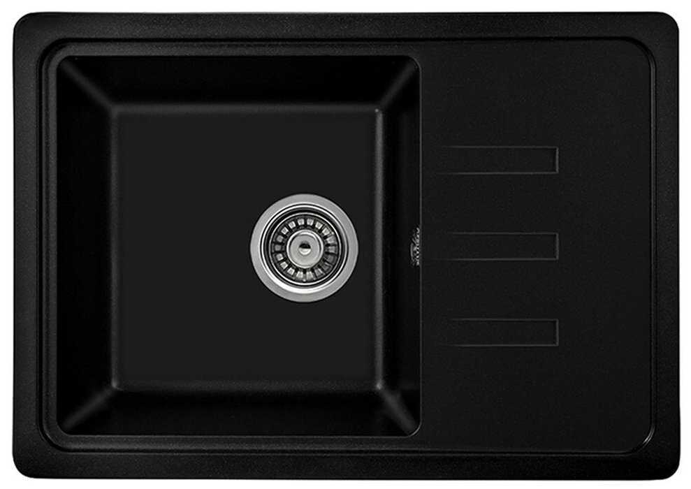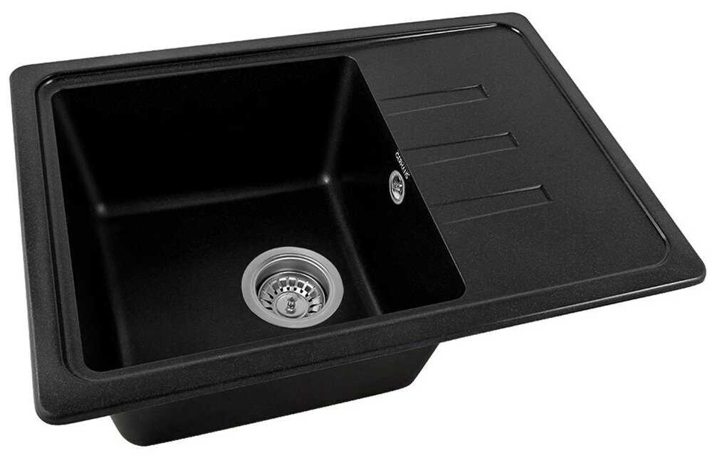 На фото врезная мойка из искусственного камня на полтора отделения, с сушкой, черного цвета.