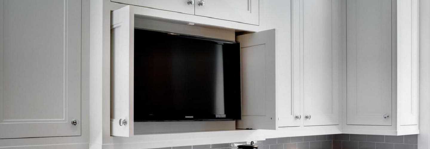- в фасад кухонного гарнитура. Такой телевизор гарантирует сохранение стиля в интерьере помещения. Заранее продуманное расположение не вызовет дополнительных проблем с размещением прибора;