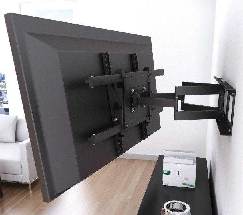 - Способы монтажа. Комплектация всех современных телевизоров стандартно включает в себя подставку для размещения девайса на тумбе или столе. Некоторые из них могут превращаться в подвесные системы. Но для кухонь чаще всего востребованы специальные кронштейны, позволяющие устанавливать телевизор под определенным углом. Такая деталь редко встречается в стандартном наборе, но некоторые производители все же балуют своих покупателей.