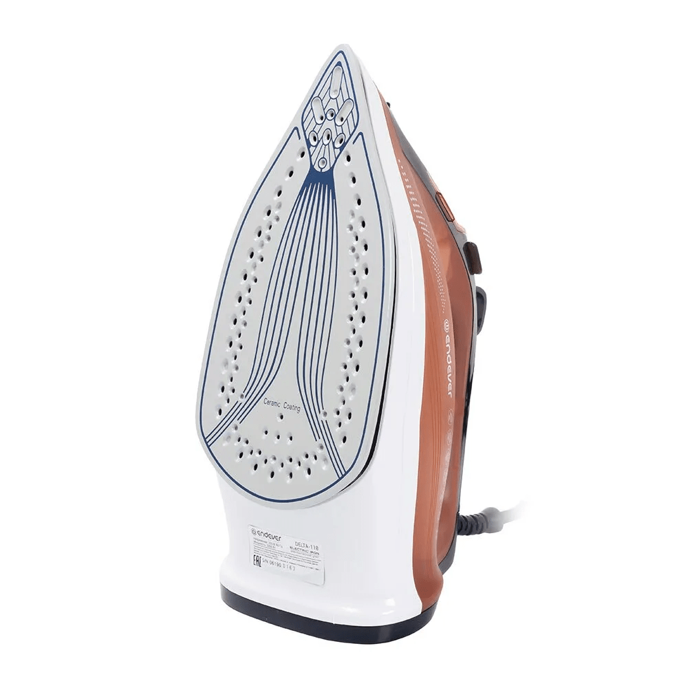 Один из лучших паровых утюгов мощностью 2200 Вт, доступный в белом и коричневом цветах на выбор. Имеет прочную керамическую подошву, которая равномерно скользит практически по любой поверхности и без каких-либо проблем справляется с повышенными нагрузками. При равномерной подачи пара влага расходуется со скоростью 20 грамм в минуту. Модель оснащена прочным сетевым шнуром длиной 1.8 метра, который позволит удобно работать даже на высокой гладильной доске.