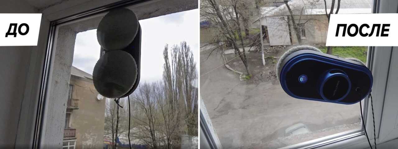 Я запустил мойщика один раз на внутренней и один раз на внешней стороне стекла, без замены салфеток. Результат, по сравнению с немытым окном, можете видеть сами. Основная поверхность вымыта почти идеально, ни потёков, ни разводов не осталось. Вдоль рам и в углах – чуть хуже, но это проблема абсолютно всех мойщиков.