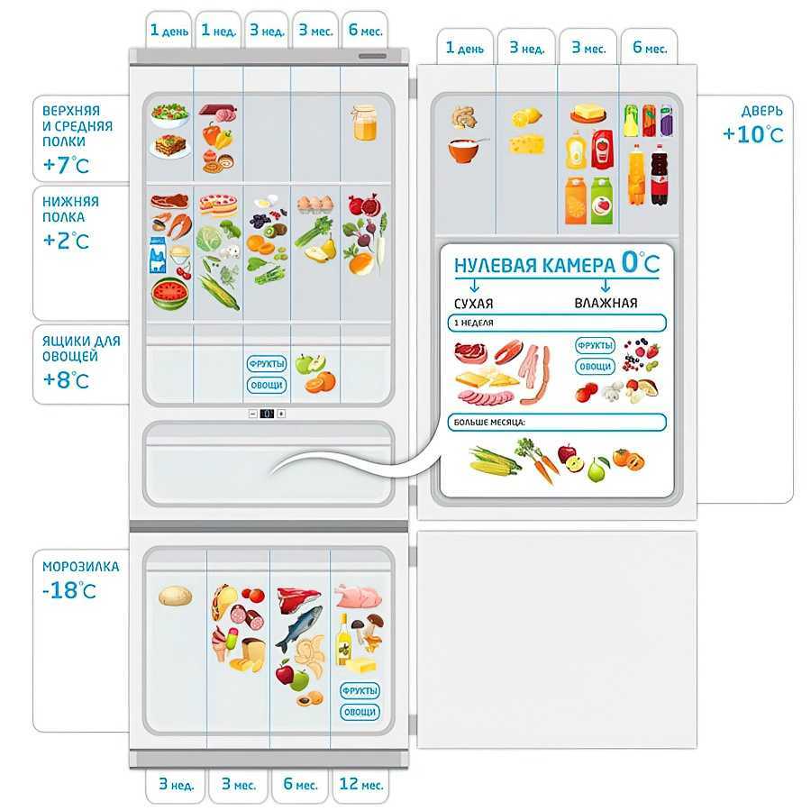 Большинство моделей устроены таким образом, что в разных участках холодильника поддерживается разная температура. Грамотное распределение продуктов по этим условным зонам, обеспечит лучшую сохранность. Температурные зоны распределяются так: