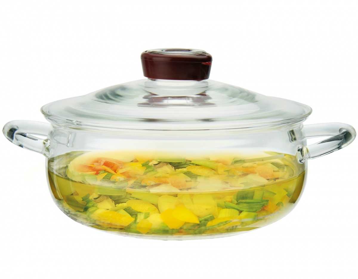 Посуда для стеклокерамической варочной панели из стекла также справляется со своим основным предназначением. В то же самое время, у этого материала достаточно невысокие показатели теплопроводности, а значит и времени на приготовление пищи придется потратить больше, особенно по сравнению с другими материалами.
