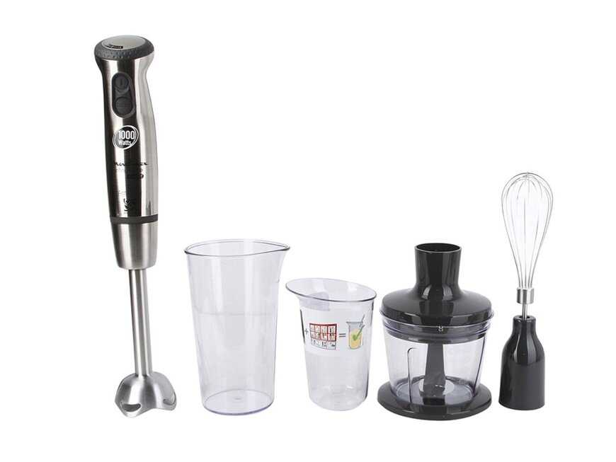 С помощью мерного стаканчика можно отмерить определенное количество ингредиентов. В комплекте есть венчик для взбивания, насадка для приготовления картофельного пюре. Погружной элемент блендера сделан из нержавеющей стали, корпус устройства полностью пластиковый.