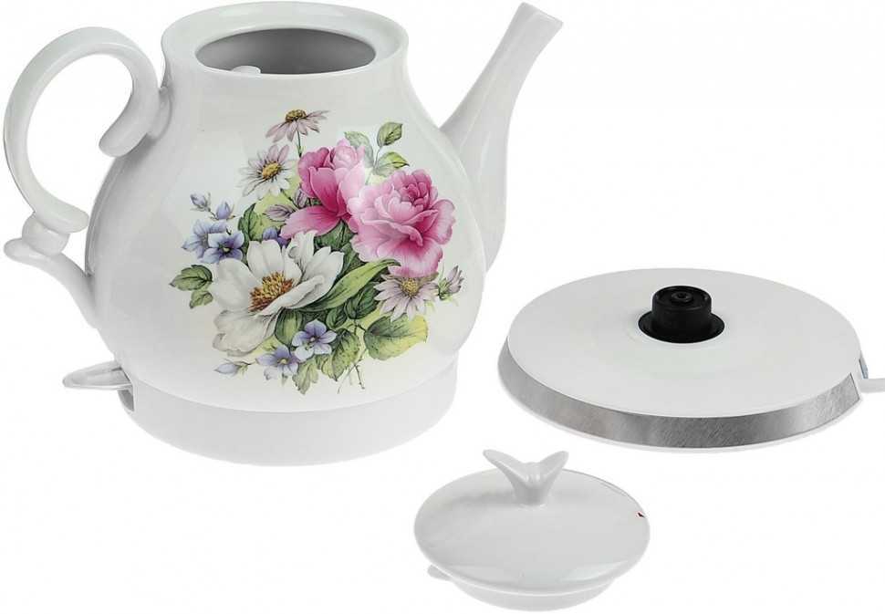 Лучшим электрическим чайником на 2020 год из керамики пользователи выбрали модель от отечественного производителя. Рисунок нанесён крайне качественно и не истирается при обслуживании. Крышка полностью съёмная, что заметно облегчает капитальную обработку.