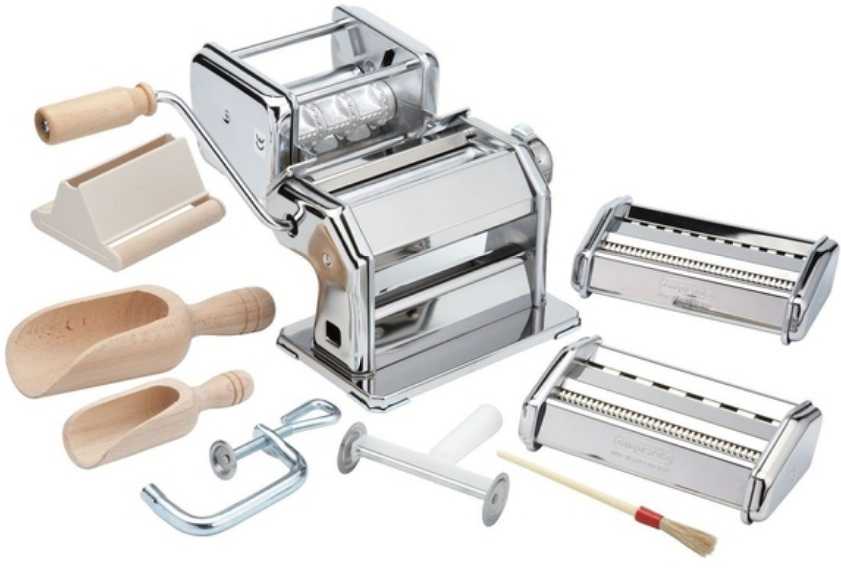 Техника для кухни в корпусе (отполирован) из пищевой нержавеющей стали, относится к профессиональной линии оборудования. В набор входит: 2 деревянных совка различного размера, насадка для равиоли, роликовый резак, кисточка для чистки из натуральных волокон, 4 насадки лапшерезки.