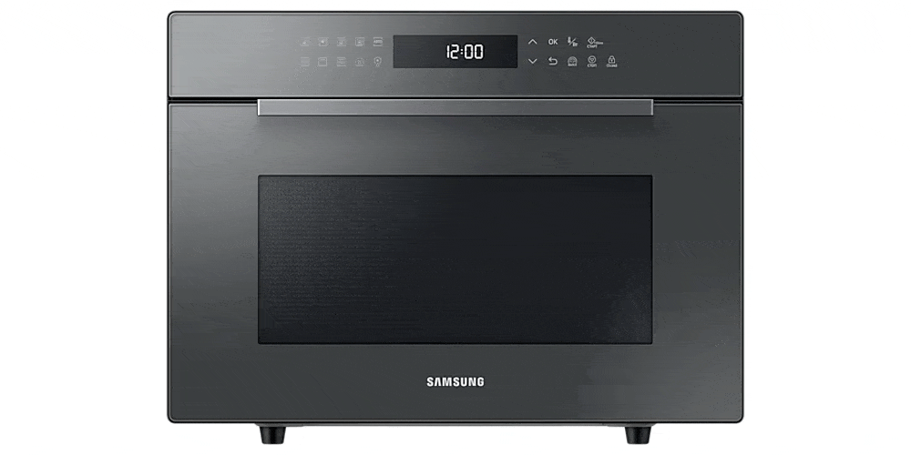 В этом сегменте лучшей стала Samsung MC35R8088LC/BW. Микроволновая печь очень стильно выглядит, имеет большие габариты и большой объём внутренней камеры – 35 л, диаметр поворотного поддона – 38 см. Модель представлена в трёх цветах. Внутри камера имеет биокерамическое покрытие, как и предыдущая печь, что обеспечивает лёгкость очистки и отсутствие среды для распространения бактерий. Она оснащена множеством технологий, которые улучшают качество готовки. Технология HotBlast обеспечивает быстрое приготовление блюд за счёт мощного потока горячего воздуха, который проникает через специальные отверстия и прогревает блюдо со всех сторон. Технология AirFry сочетает гриль с циркуляцией горячего воздуха. Это способствует образованию аппетитной хрустящей корочки без ущерба для сочности. Модель оснащена инновационным мощным двойным грилем, который равномерно распределяет тепло в рабочей камере.