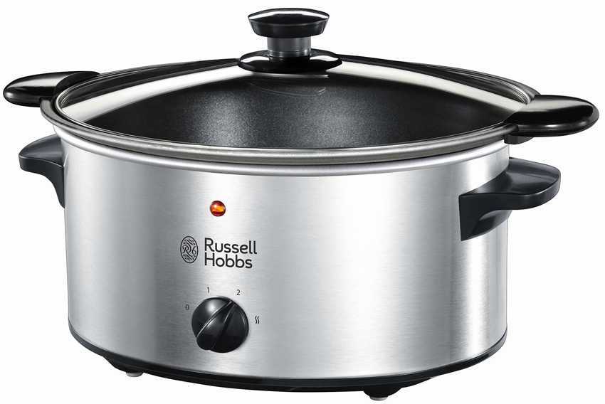 Компактной, аккуратной моделью является Russell Hobbs 22740-56 в форме кастрюли, что продемонстрировано на фото мультиварки. Корпус выполнен из нержавеющей стали. Модель укомплектована металлической чашей с тефлоновым покрытием на 3,5 л. Устройство имеет три уровня мощности и функцию «свой рецепт». Мультиварка оснащена механическим управлением. Мощность устройства составляет всего 160 Вт, что подтверждает наличие медленного процесса приготовления пищи. Купить медленноварку можно от 2,8 тыс. руб.