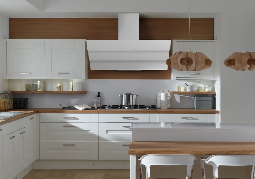 Если предполагается установка наклонной вытяжки в классической кухне, цвет модели подбирают в тон остальному оформлению. Корпус устройства нередко дополнительно декорируют деревом, что хорошо комбинируется с классическими и деревенскими (кантри) фасадами.